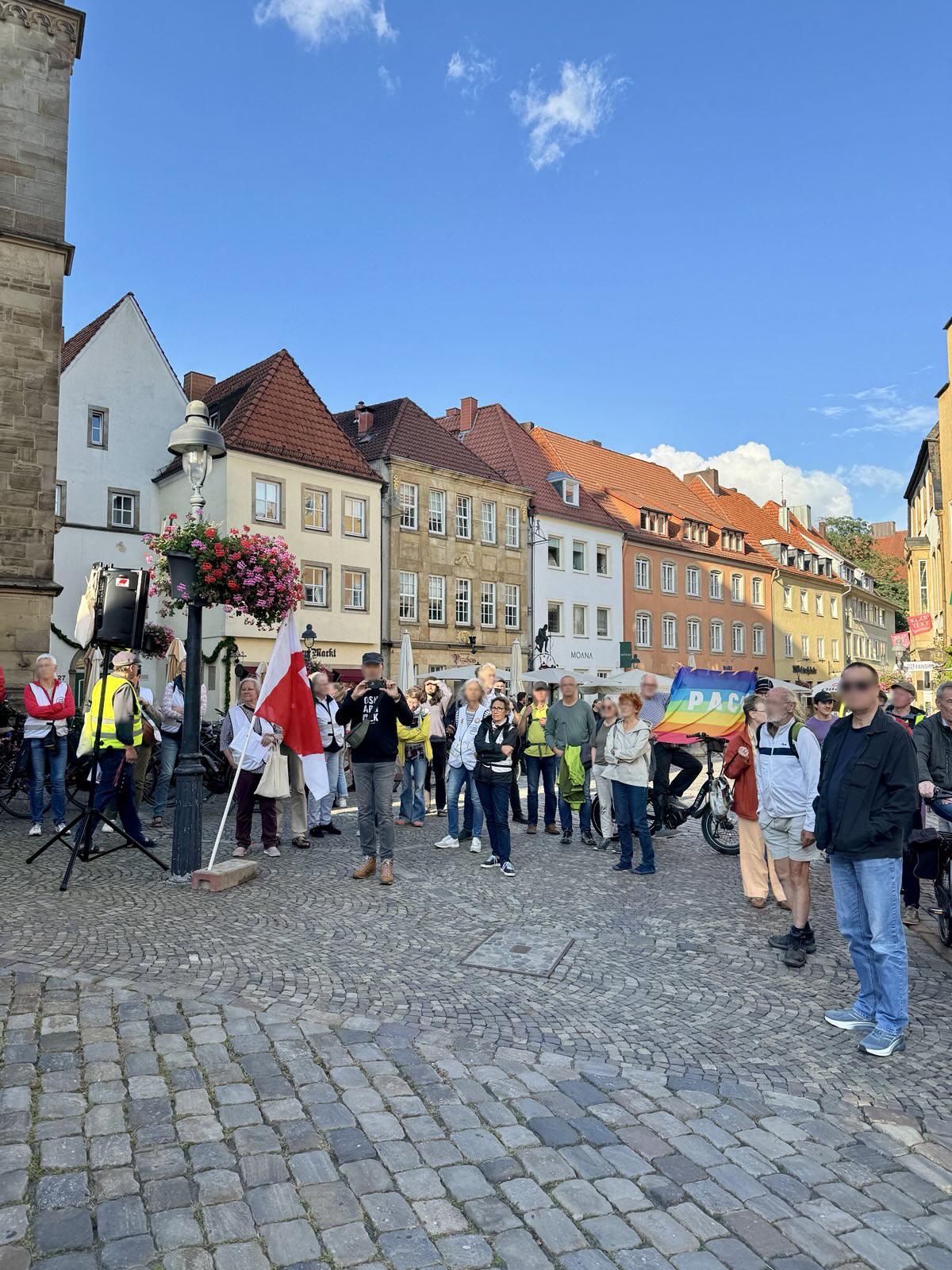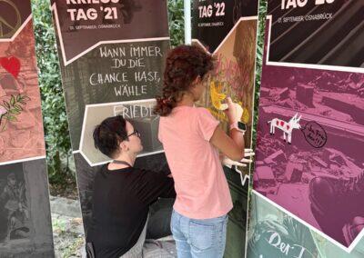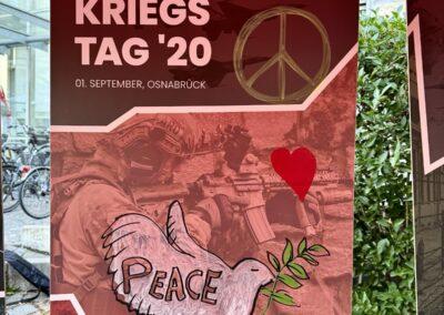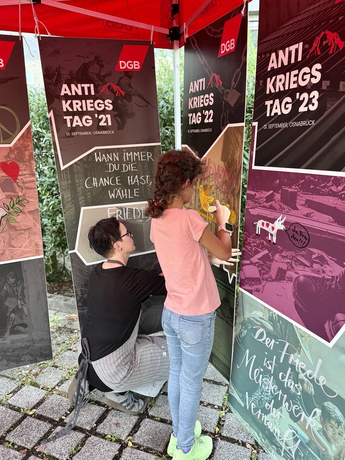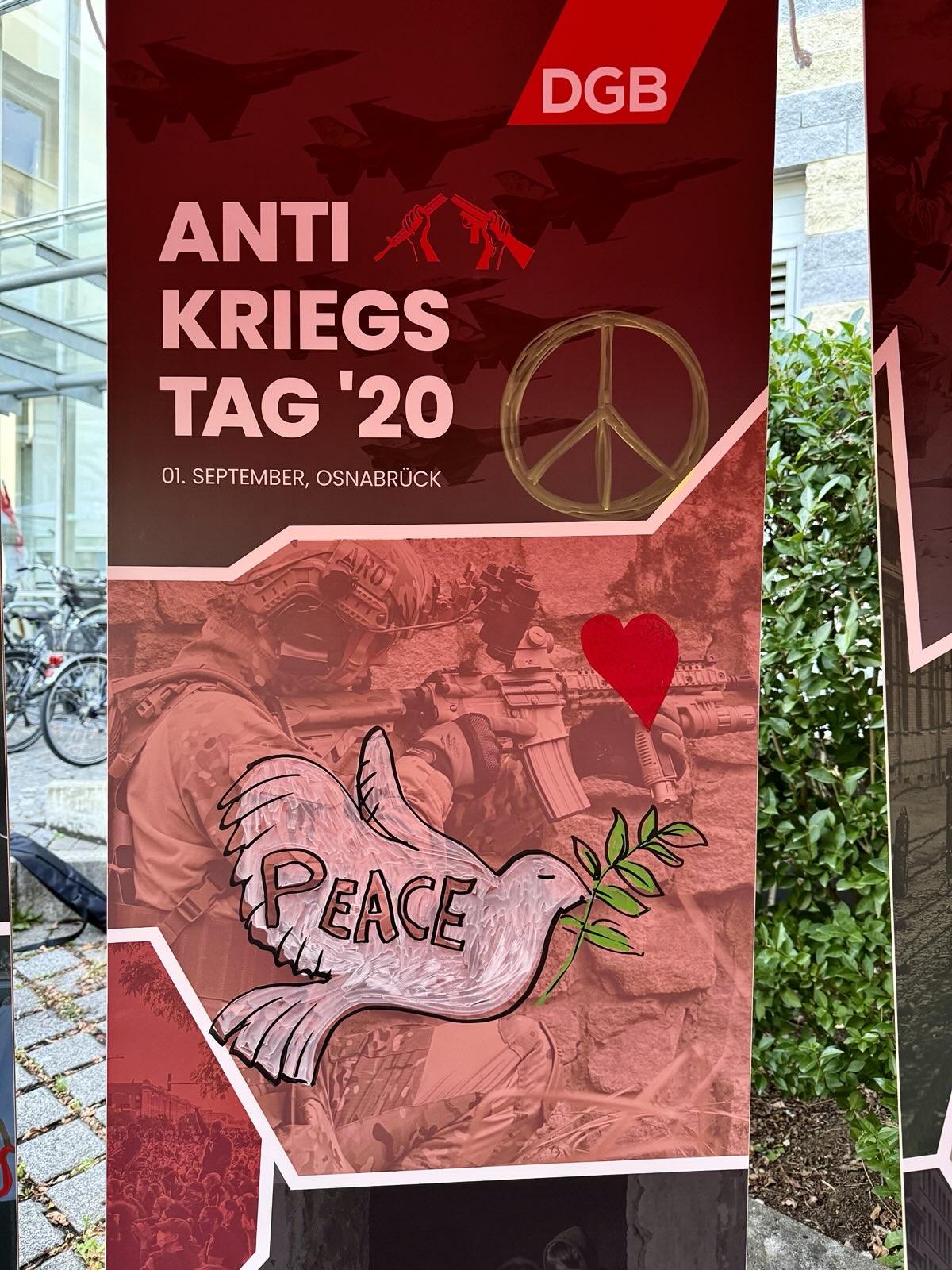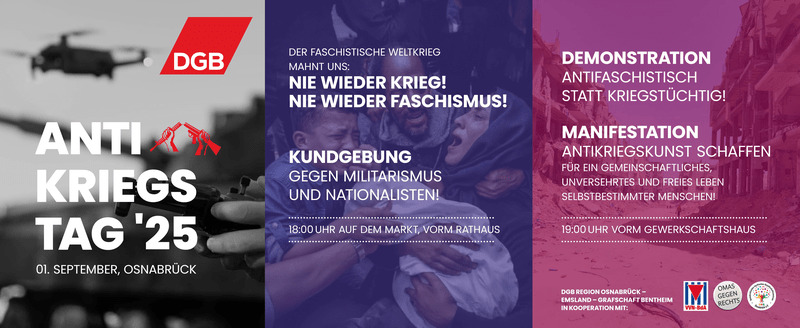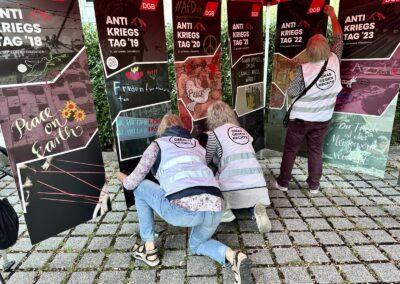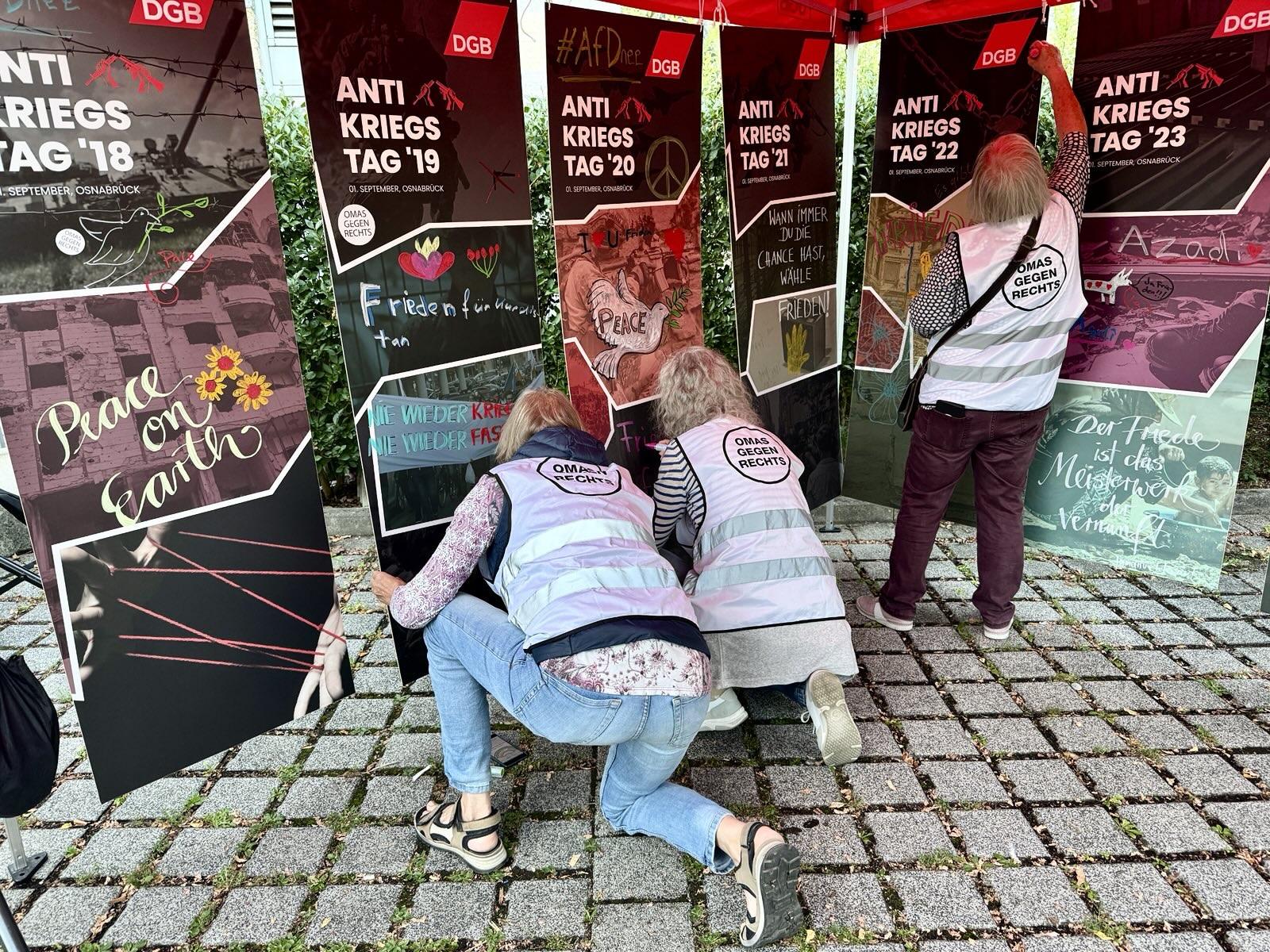 Gemeinsam mit dem DGB begingen wir am 1. September 2025 den Antikriegstag mit einer Kundgebung, einer Demonstration und einer gemeinsamen Kunstaktion. Nachdem wir OMAS GEGEN RECHTS in unserem Redebeitrag gemahnten, friedensfähig zu bleiben anstatt kriegstüchtig zu werden, gestalteten wir gemeinsam Kriegsbilder zu Antikriegskunst um.