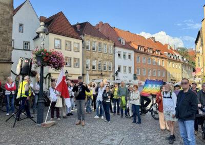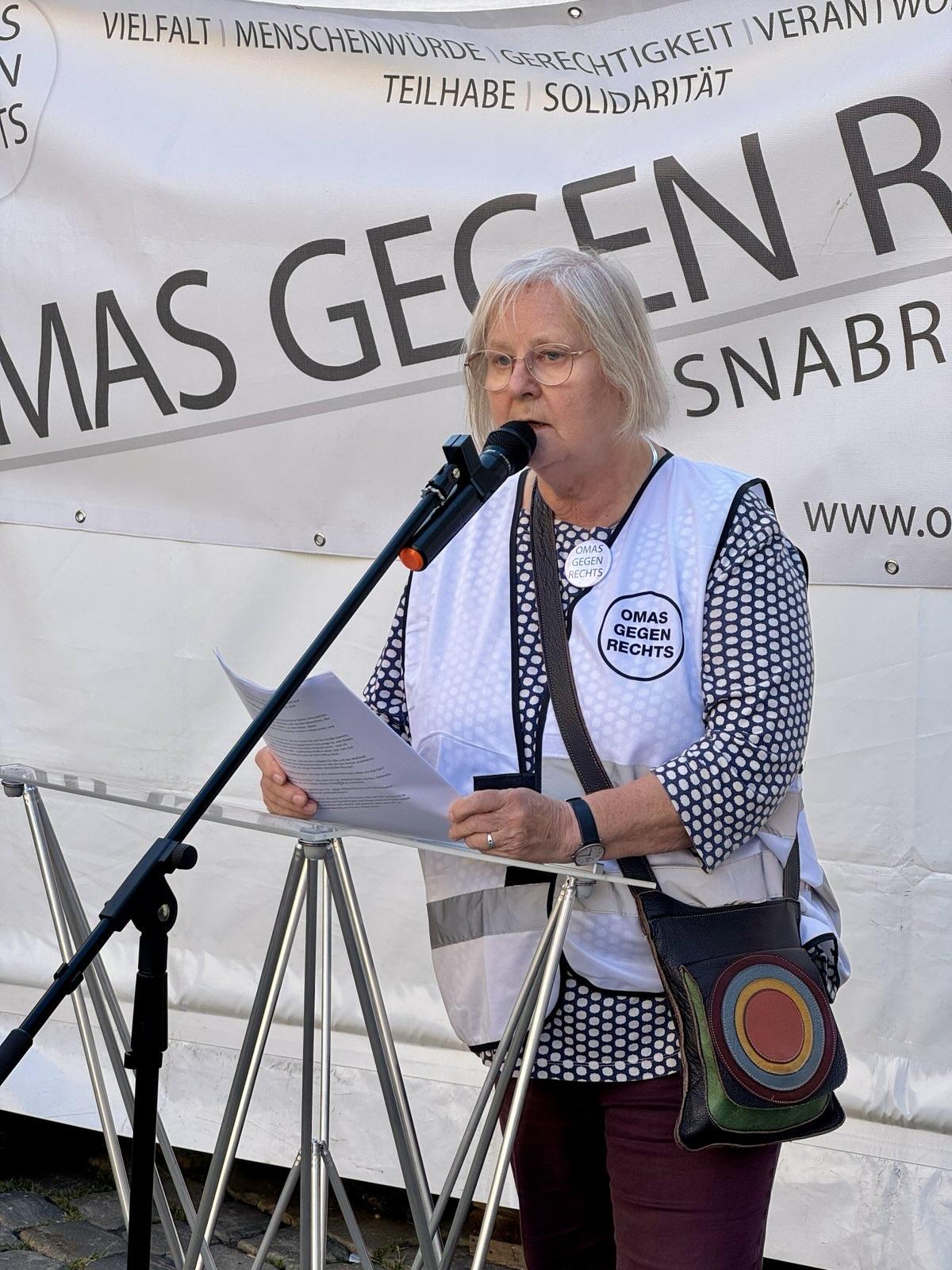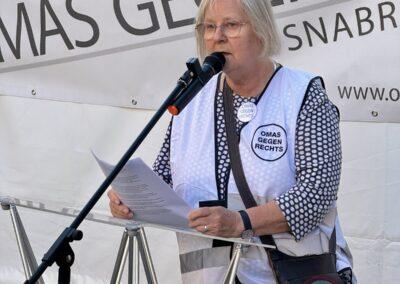Friedensfähig zu werden heißt, sich für demokratische Werte einzusetzen, sie den Menschen, die zu uns kommen und mit uns leben wollen, zu vermitteln und sie gegenüber innerer Bedrohung zu schützen. Nicht Ausgrenzung und Abschottung ist die Lösung, sondern miteinander und solidarisch leben! Viele von uns OMAS und auch ihr, die ihr heute mit auf die Straße kommt, habt erfahren, wie mühselig dieses Engagement heutzutage ist, wie dieses Engagement sogar von politischen Vertretern bedroht wird – und ich spreche nicht nur von der AfD – reaktionäre Kräfte haben sich zum Ziel gesetzt, Demokratie zu zerstören und sie sind kräftig dabei.